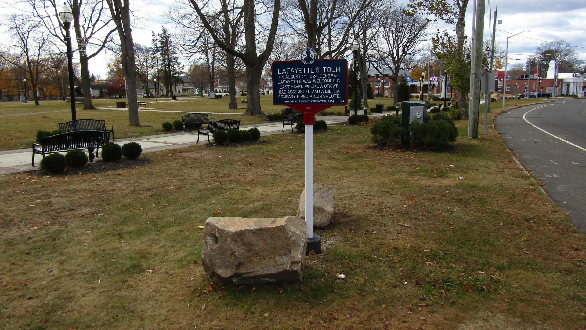 On August 21, 1824, General Marquis de Lafayette was warmly welcomed in East Haven, Connecticut, during his celebrated Farewell Tour of the United States. A crowd assembled on or near the East Haven Green to greet Lafayette, and a militia company fired a gun salute in his honor. After a public breakfast, Lafayette toured Yale College, named in honor of Elihu Yale, Esq. He afterwards visited Mrs. Faith Trumbull, widow of Jonathan Trumbull, who served as governor of Connecticut during the Revolution.