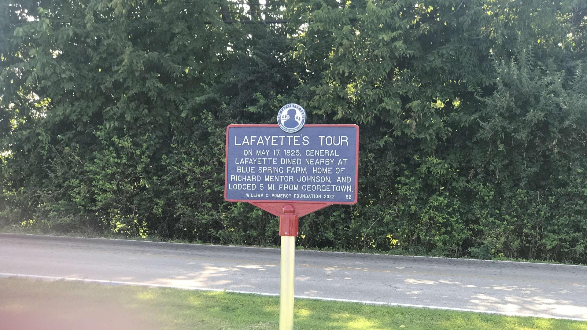 On May 17, 1825, General Lafayette dined at Blue Spring Farm near Georgetown, Kentucky. Lafayette was hosted by Colonel Richard Mentor Johnson, a veteran of the War of 1812, a prominent Kentucky politician, and future Vice President of the United States (under Martin Van Buren). He departed early the next morning, continuing his journey toward Cincinnati, Ohio.