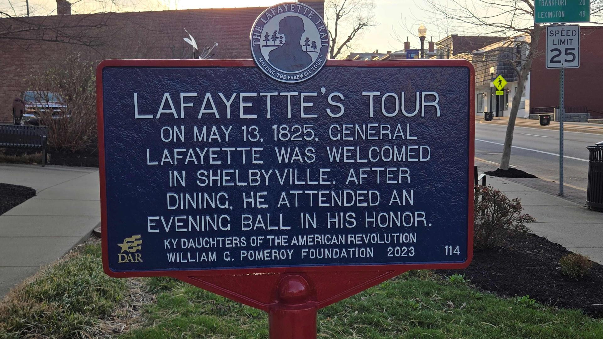 The Marquis de La Fayette and party left Louisville, embarking on a tour of central Kentucky. They journeyed down the Old State Pike to Shelbyville for the night. On May 13, 1825, General Lafayette was warmly received in Shelbyville, Kentucky, where he dined and attended an evening ball held in his honor.