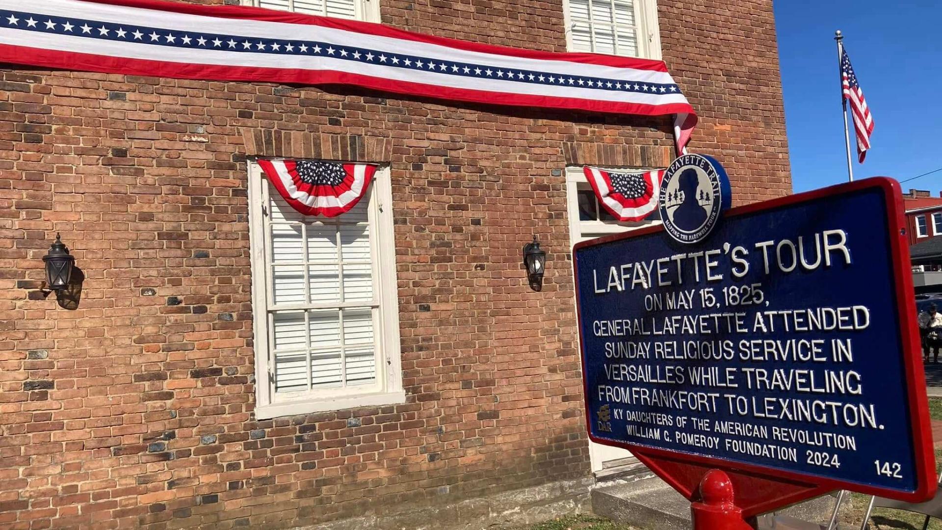 Lafayette did not normally travel on Sundays, but his schedule was tight if he was to make it to Massachusetts by June for the dedication of the Bunker Hill monument. Upon arrival in Versailles, Lafayette was welcomed at the home of Mrs. George Taylor Cotton, Sr., daughter of Major John O’Bannon. Lafayette then visited Watkins Tavern, operated by Henry Watkins and his wife, Elizabeth Hudson Clay Watkins (mother of Henry Clay). After attending religious services, he departed for Lexington.