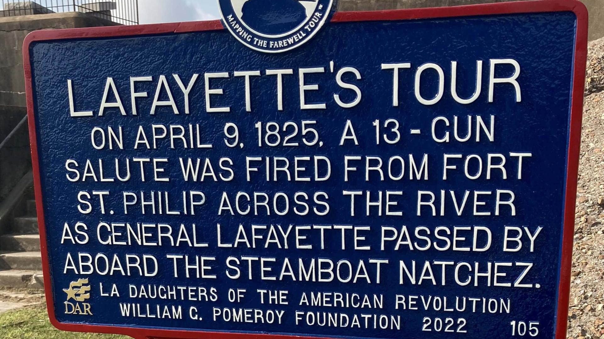 Traveling along the Mississippi River by steamboat, General Lafayette arrived in Buras, Louisiana, on April 9, 1825, aboard the Natchez. A thirteen-gun salute was fired from Fort St. Philip (formerly Fort Plaquemine) when the Natchez passed by as Lafayette continued his tour to New Orleans, Louisiana.