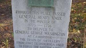 The Henry Knox Trail, also known as the Knox Cannon Trail, is a network of roads and paths that traces the route of Colonel Henry Knox's "noble train of artillery" from Crown Point, New York, to the Continental Army camp outside Boston, Massachusetts, in the American Revolutionary War. George Washington commanded Henry Knox in 1775 to transport 59 cannons (weighing over 60 tons) from captured forts on Lake Champlain, 30 from Fort Ticonderoga, and 29 from Crown Point to the army camp outside Boston to aid the war effort against British forces. They included forty-three heavy brass and iron cannons, six coehorns, eight mortars, and two howitzers.