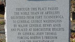 The Henry Knox Trail, also known as the Knox Cannon Trail, is a network of roads and paths that traces the route of Colonel Henry Knox's "noble train of artillery" from Crown Point, New York, to the Continental Army camp outside Boston, Massachusetts, in the American Revolutionary War. George Washington commanded Henry Knox in 1775 to transport 59 cannons (weighing over 60 tons) from captured forts on Lake Champlain, 30 from Fort Ticonderoga, and 29 from Crown Point to the army camp outside Boston to aid the war effort against British forces. They included forty-three heavy brass and iron cannons, six coehorns, eight mortars, and two howitzers.