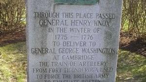 The Henry Knox Trail, also known as the Knox Cannon Trail, is a network of roads and paths that traces the route of Colonel Henry Knox's "noble train of artillery" from Crown Point, New York, to the Continental Army camp outside Boston, Massachusetts, in the American Revolutionary War. George Washington commanded Henry Knox in 1775 to transport 59 cannons (weighing over 60 tons) from captured forts on Lake Champlain, 30 from Fort Ticonderoga, and 29 from Crown Point to the army camp outside Boston to aid the war effort against British forces. They included forty-three heavy brass and iron cannons, six coehorns, eight mortars, and two howitzers.