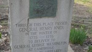 The Henry Knox Trail, also known as the Knox Cannon Trail, is a network of roads and paths that traces the route of Colonel Henry Knox's "noble train of artillery" from Crown Point, New York, to the Continental Army camp outside Boston, Massachusetts, in the American Revolutionary War. George Washington commanded Henry Knox in 1775 to transport 59 cannons (weighing over 60 tons) from captured forts on Lake Champlain, 30 from Fort Ticonderoga, and 29 from Crown Point to the army camp outside Boston to aid the war effort against British forces. They included forty-three heavy brass and iron cannons, six coehorns, eight mortars, and two howitzers.