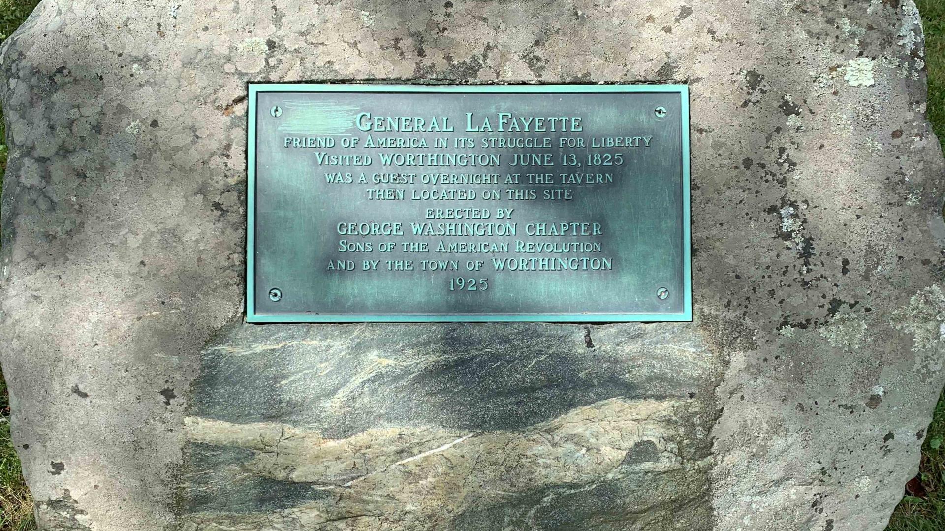 General Lafayette visited Worthington on his way from Albany to Boston on June 13, 1825, and spent the night as a guest at the Pierce Tavern, which was once located on this site (now the Worthington Library). Following his stop, Lafayette departed for Boston, where he was to lay the cornersone for the Bunker Hill Monument. He was greeted by forty mounted riders, including Colonel William A. Rice, a decorated veteran who served in the War of 1812.