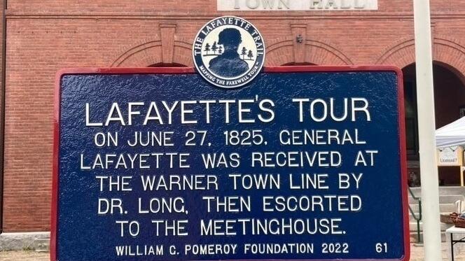On June 27, 1825, General Lafayette visited Warner, New Hampshire. An article in the July 9, 1825 edition of The Farmer’s Cabinet captures the visit details: On reaching the line of Warner, an escort of citizens was ready to receive him [Lafayette] and a short address was made by Dr. Long. He was then escorted to the village at the meeting house, where a table was set on the common, with refreshments of which he partook; and then resumed his route. Salutes were fired as he passed through this town.