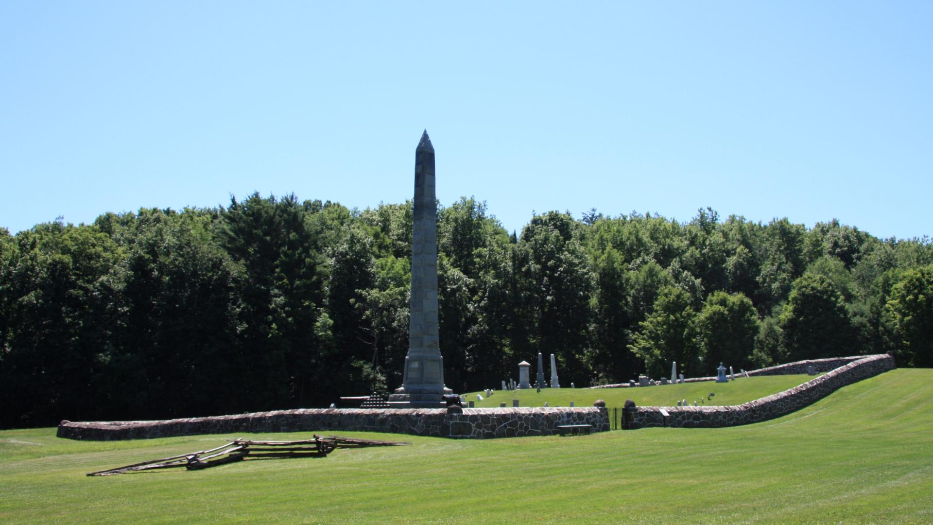 A grave marker was erected to honor the death of Brigadier General Nicholas Herkimer, an American militia officer, for his services in the French and Indian and Revolutionary wars. When British and Loyalist forces besieged Fort Stanwix (Fort Schuyler), Herkimer marched with about 800 Tyron County Militia to relieve the fort. Near Oriskany Creek, his column was ambushed by a combined force of Loyalists, Hessians, and Mohawk warriors. Herkimer’s horse was shot, and he suffered a devastating leg wound.