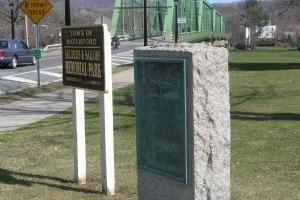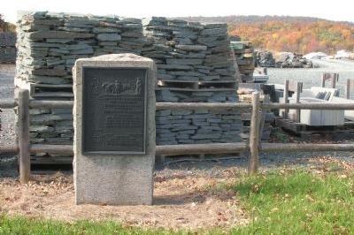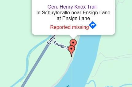 The marker is reported missing, but was similar to the others posted along the route. It was located on the river road south of Schuylerville at the Ensign House along the west side of State Route 32. The top of the marker contained a relief scene of Gen. Knox overseeing several teams of oxen dragging the artillery pieces. This site marks a house where Knox stayed on the night of December 24th.
