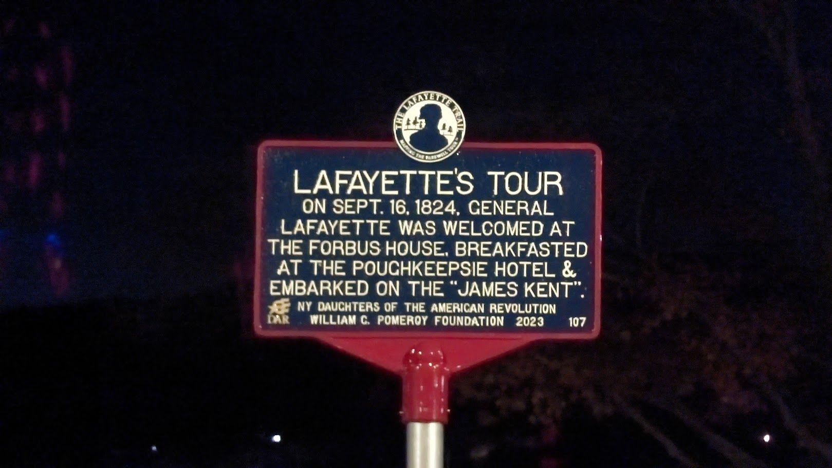 Lafayette came ashore from the steamboat James Kent early on the morning of September 16, 1824. He was greeted by a procession of citizens and militia commanded by General Brush. He was welcomed at the Forbus House, where he met with the village's trustees. The procession commenced at the Poughkeepsie Hotel, where breakfast was served for sixty-five people.
