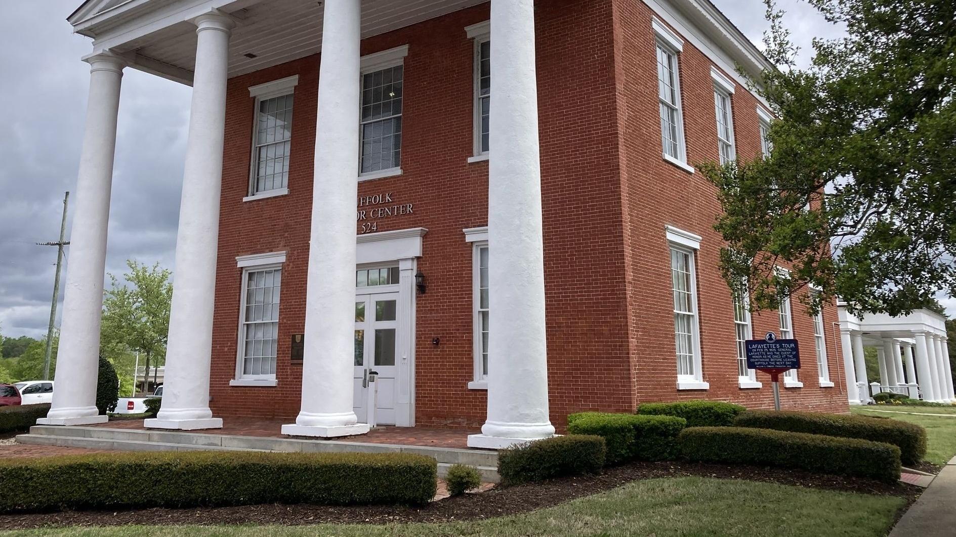 President James Monroe invited the Marquis de Lafayette to visit the United States, his adopted country. Lafayette’s tour of all 24 states in 1824 and 1825 drew large crowds and sparked a renewal of patriotism. During the American Revolution, Lafayette’s intense advocacy of the American cause had convinced French King Louis XVI to send troops and ships, which proved crucial to the American victory at Yorktown. Lafayette dined at the Suffolk County Courthouse on February 25, 1825. The following morning, Lafayette departed for Murfreesboro, North Carolina. American troops occupied Suffolk during the Revolutionary War, and a British force burned it on 13 May 1779.