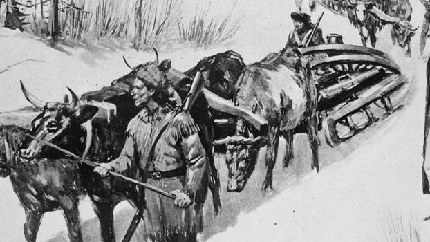 The twenty-five year old Knox hatched a plan to go to Fort Ticonderoga, retrieve the cannons and bring them back to Boston and Washington’s Army. With Washington’s blessing, Knox and a contingent of hearty men headed out on November 16, 1775. Arriving at the fort on December 5, the energetic Knox began to take inventory of what was to be had. Using his self-trained eye he settled on 58 pieces-- mostly mortars and 12 and 18-pound cannons and their required munitions. During the close to 300 mile trek lugging their treasure back to Boston, Knox and his men endured severe winter weather conditions, but they proved to be inventive in figuring out how to haul tons of guns over freezing cold lakes and rivers, sometimes caked with ice, bitter cold, snowfall and subsequent thawing, as they struggled with their oxen teams on specially designed sleds to cross the Berkshire Mountains of Western Massachusetts. All along the route Knox kept his wife informed in letters and maintained a diary in which at one point he wrote, “It appeared to me almost a miracle that people with heavy loads should be able to get up and down such hills.” The train arrived in Boston by mid-January 1776, completely intact, not a gun lost. With this formidable battery at his disposal, Washington was able to implement Knox’s plan of siege. In March, shortly after the Dorchester Heights were fortified, the British evacuated the city.
